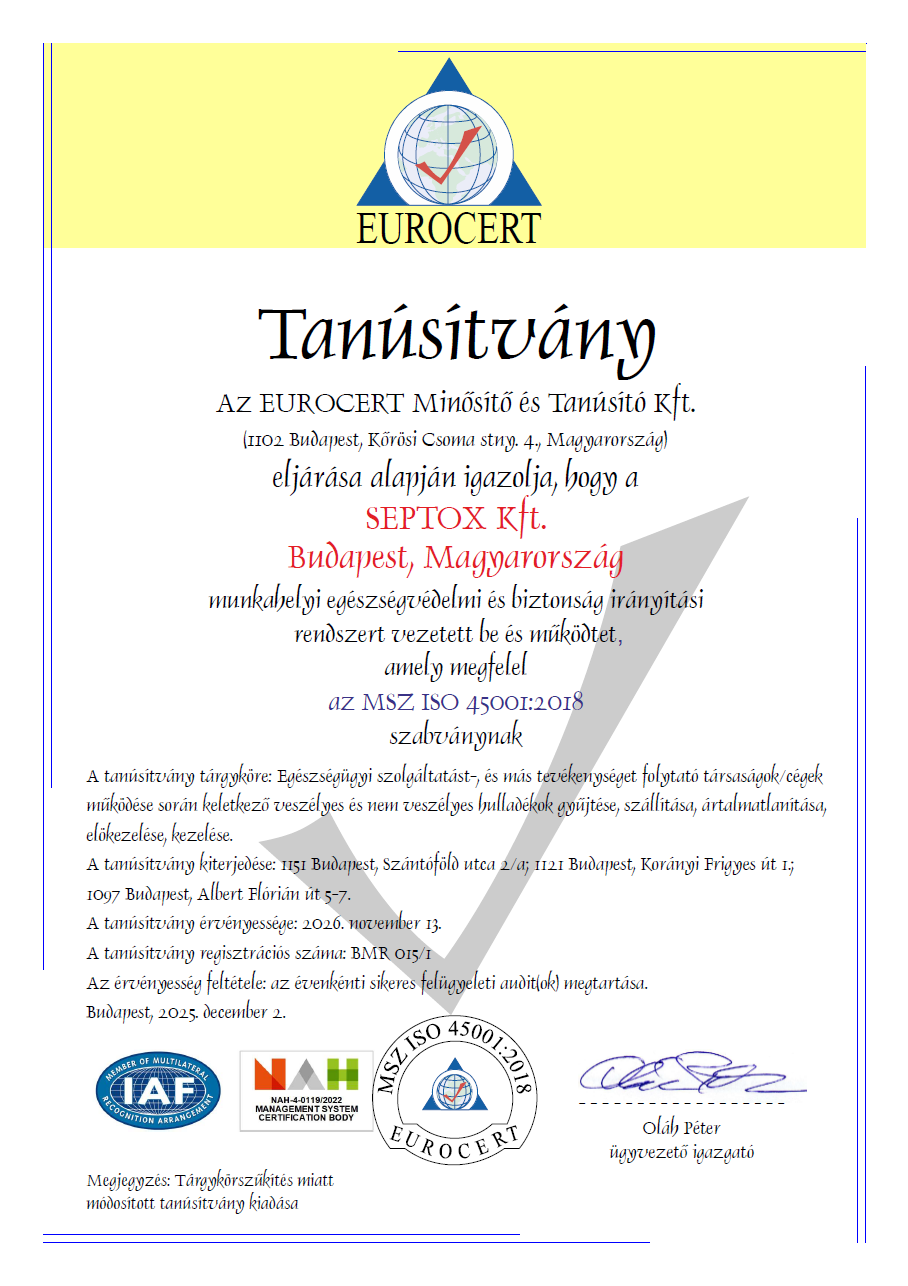 2008-ban az OHSAS 18001 szabvány követelményeinek megfelelve bevezetésre került a Munkahelyi Egészségvédelmi és Biztonsági Irányítási Rendszer (MEBIR). A szabvány változását követően MEBIR rendszerünk átdolgozásra került az MSZ ISO 45001:2018 szabványkövetelmények előírása szerint, az új szabványra való sikeres áttérést a tanúsító szervezet igazolta.